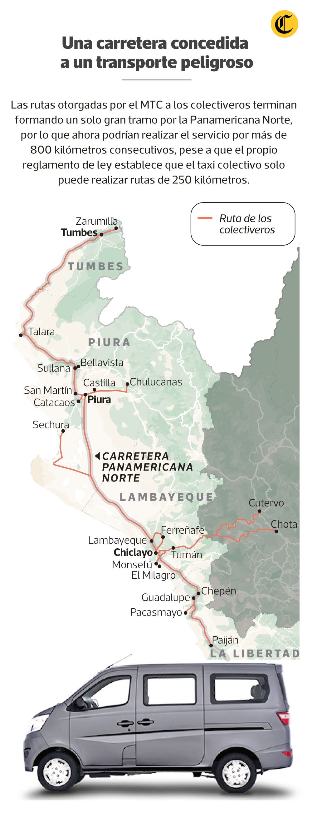 La gestión pasada del Ministerio de Transportes y Comunicaciones (MTC), bajo el mando de la entonces ministra Paola Lazarte, dejó listo un proyecto de Resolución Ministerial donde se definieron todas las rutas que serían autorizadas para el taxi colectivo en la zona norte del país, informó El Comercio en un informe pasado. Este incluye 190 rutas de más de 100 kilómetros, entre ellas la Panamericana Norte, permitidas para la modalidad de colectivo. Especialistas consultados por este Diario mostraron su preocupación ante la posible oficialización de esta medida pues atentaría contra la seguridad de todos los pasajeros.