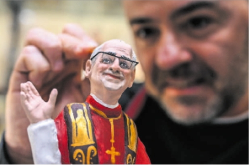 El artista Genny di Virgilio pinta una estatuilla de terracota que representa al recién elegido papa en la Via San Gregorio Armeno, también conocida como Calle de los Belenes, en Nápoles, Italia.