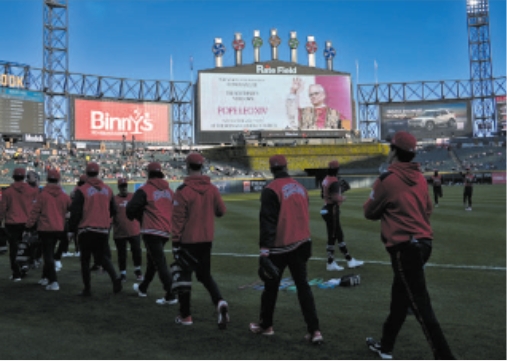 Los jugadores de los Chicago White Sox caminan por el campo mientras el marcador honra al papa León XIV antes de un partido de béisbol en Chicago, su ciudad natal.