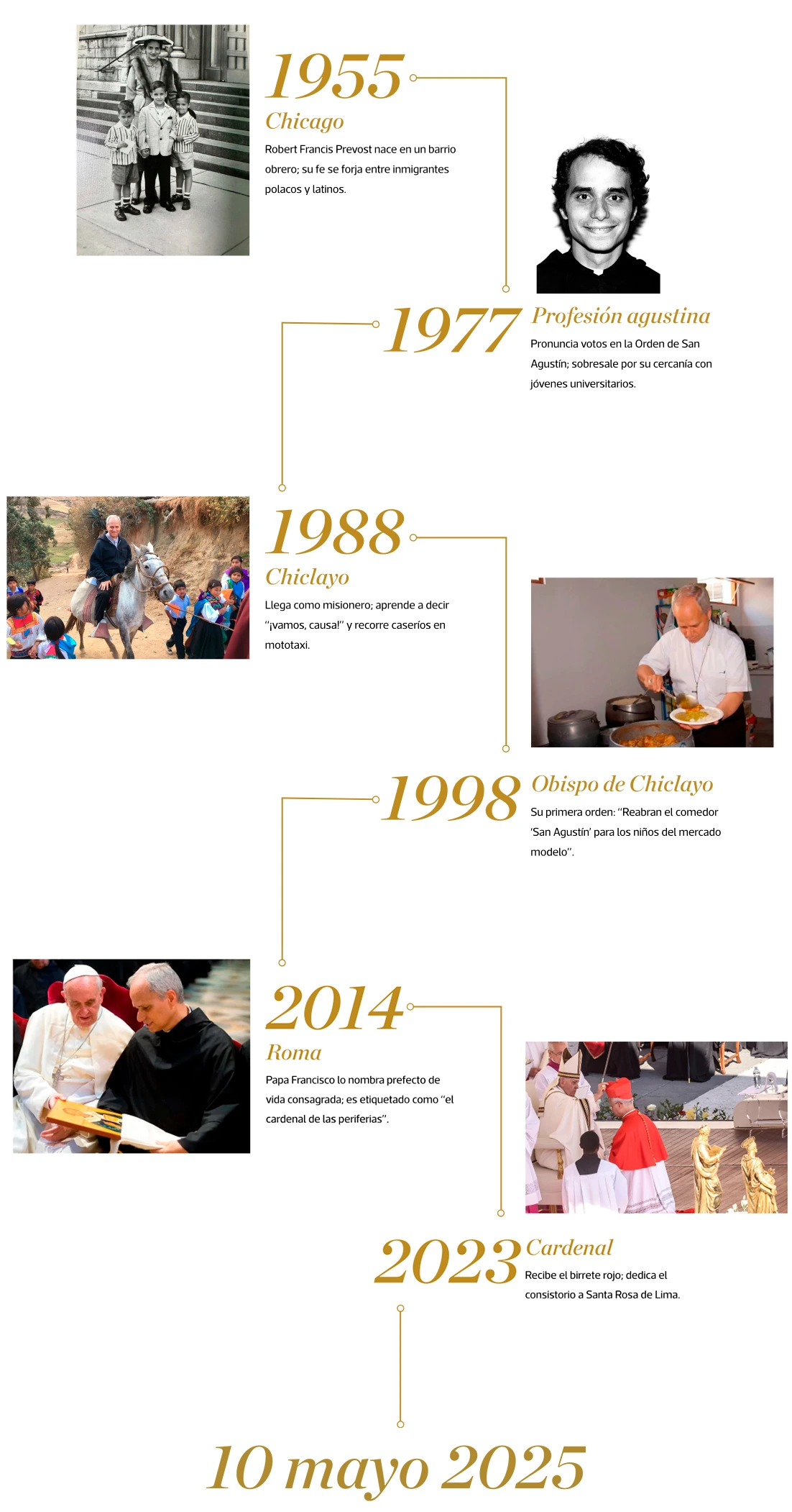 Nació en Chicago ( 1955 ). Misionero agustino en Chulucanas en 1985, formador en Trujillo desde 1988, obispo de Chiclayo a partir del 26 de setiembre de 2015 —año en que también obtuvo la nacionalidad peruana— y administrador apostólico del Callao en plena pandemia ( 2020-2021 ); cada destino consolidó un liderazgo cercano a las periferias que desembocó en su elección pontificia de 2025.