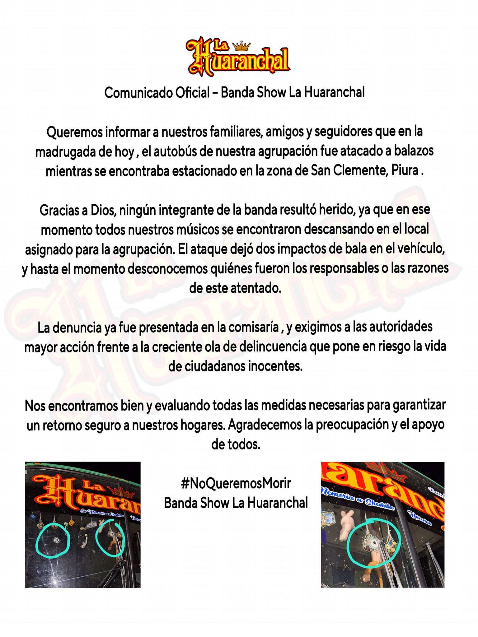 El bus de la agrupación musical La Huaranchal fue atacado a balazos la madrugada de este domingo mientras estaba estacionado en la zona de San Clemente, en la región Piura. Según las primeras indagaciones policiales, dos sujetos a bordo de una motocicleta dispararon contra el vehículo y luego huyeron del lugar.