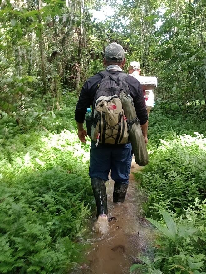 En esta oportunidad estamos realizando el patrullaje de Lagartocaña, me acompañan los compañeros Arbildo Pinchi y José Pizango, ambos de gran trayectoria en el cuidado de nuestra biodiversidad. Debemos caminar con sigilo y cuidado por entre los bosques de varillal, pues estos patrullajes se realizan para buscar posibles infractores como cazadores o madereros, así como para documentar las distintas especies de flora y fauna existentes en el área.