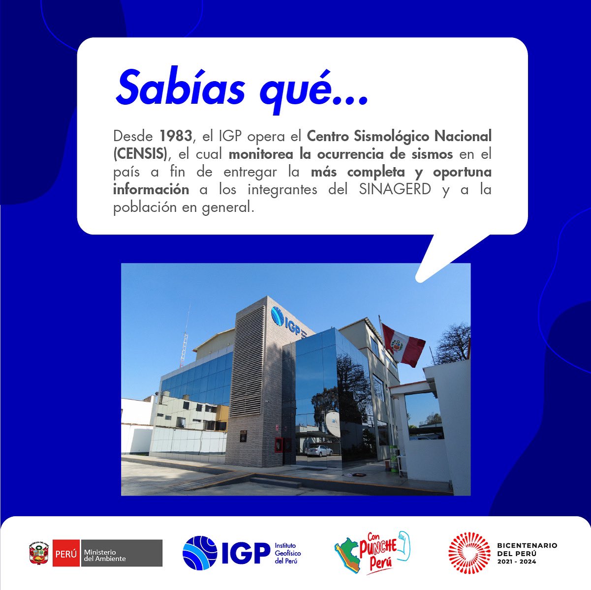 El Instituto Geofico del Perú (IGP) es un Organismo Público Descentralizado del Ministerio del Ambiente que fue creado con la finalidad de que aplique Geofísica, es decir, su primordial función es la de estudiar todos los fenómenos relacionados con la estructura, condiciones físicas e historia evolutiva de la Tierra. El IGP tiene la capacidad de servir a las necesidades del país en áreas tan importantes como: sismología, vulcanología y el estudio de El Niño.