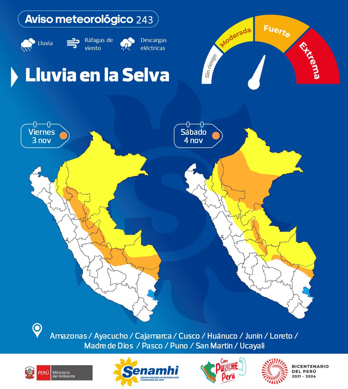 #Pronstico Selva norte y selva alta central-sur esperan lluvia de moderada a fuerte intensidad segn el aviso de corto plazo ante lluvias intensas de 24 horas https://t.co/nJrSfbWRRj pic.twitter.com/OwXYhje3SI