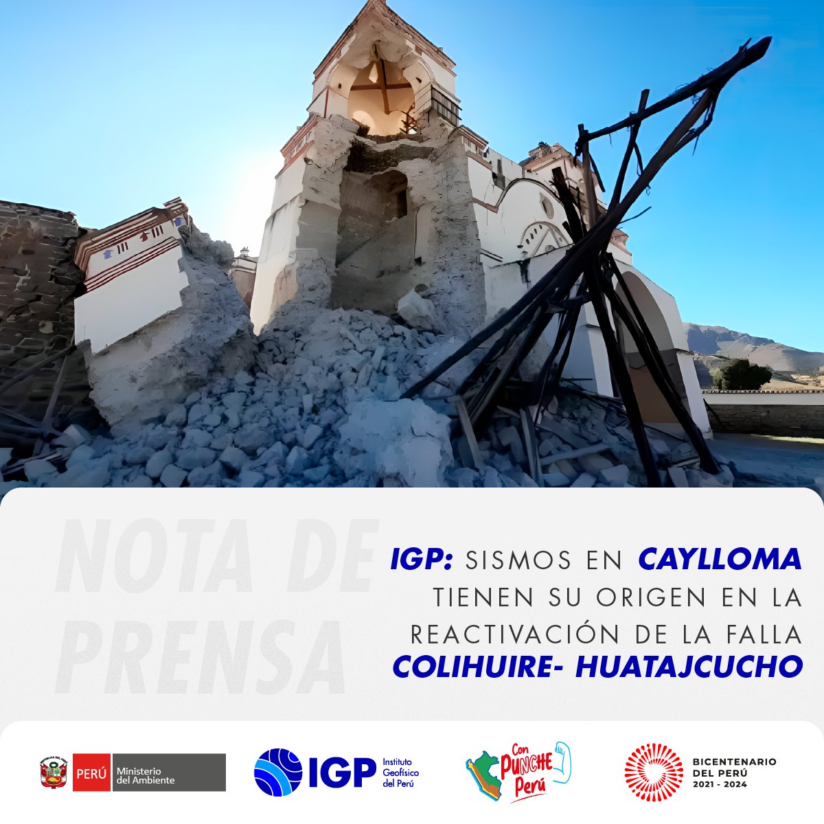 El Ministerio del Ambiente (MINAM), a través del Instituto Geofísico del Perú (IGP), informa que la serie de sismos registrados desde el día 2 de junio en la provincia arequipeña de Caylloma han sido generados debido a la reactivación temporal de la falla Colihuire-Huatajcucho, ubicada a 16 km al sur de la localidad de Maca.