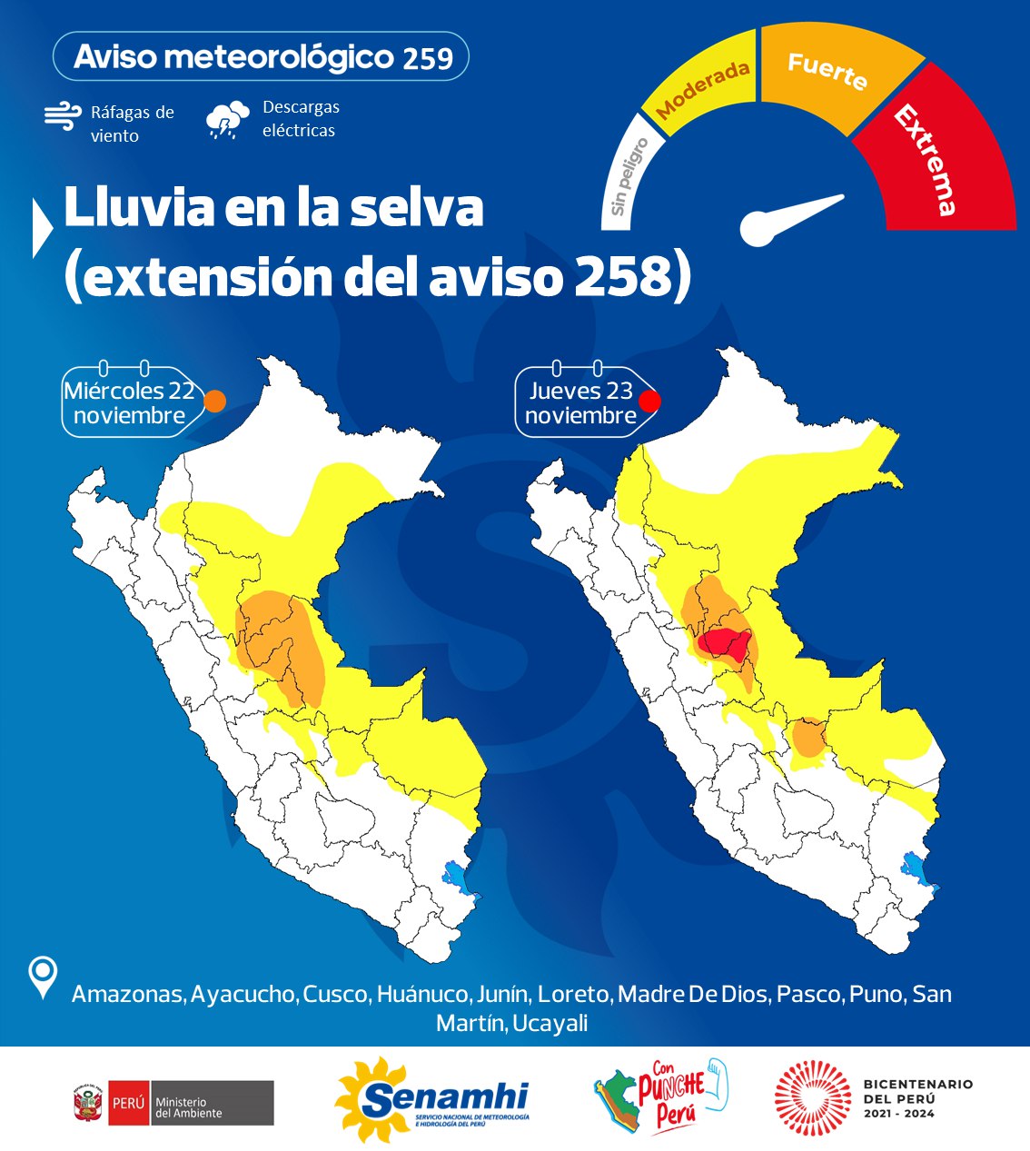 Informe del COEN sobre posibles lluvias intensas que ocurrirían hasta el 23/11 en los departamentos de Huánuco, Junín, Loreto, Pasco y Ucayali: