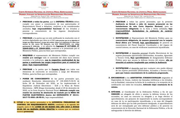 “Citar a las partes procesales a la audiencia preliminar de control de requerimiento mixto, conforme a la agenda del juzgado, para el día lunes 25 de marzo del año 2024 a horas 09:00 de la mañana (hora exacta) la misma que se realizará manera presencial”, dispuso Concepción Carhuancho.