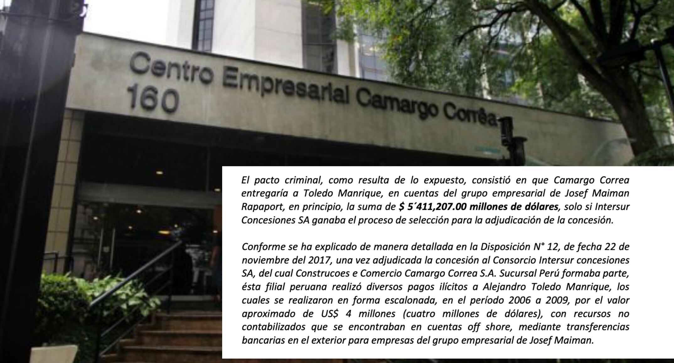 Según las tesis del Ministerio Público, Toledo Manrique habría pactado con la empresa Camargo Correa, a través de su representante, Marco de Moura Wanderley, el pago de US$6.3 millones a cambio de que el consorcio Intersur -de la que Camargo era parte- obtuviera la licitación del mencionado proyecto.