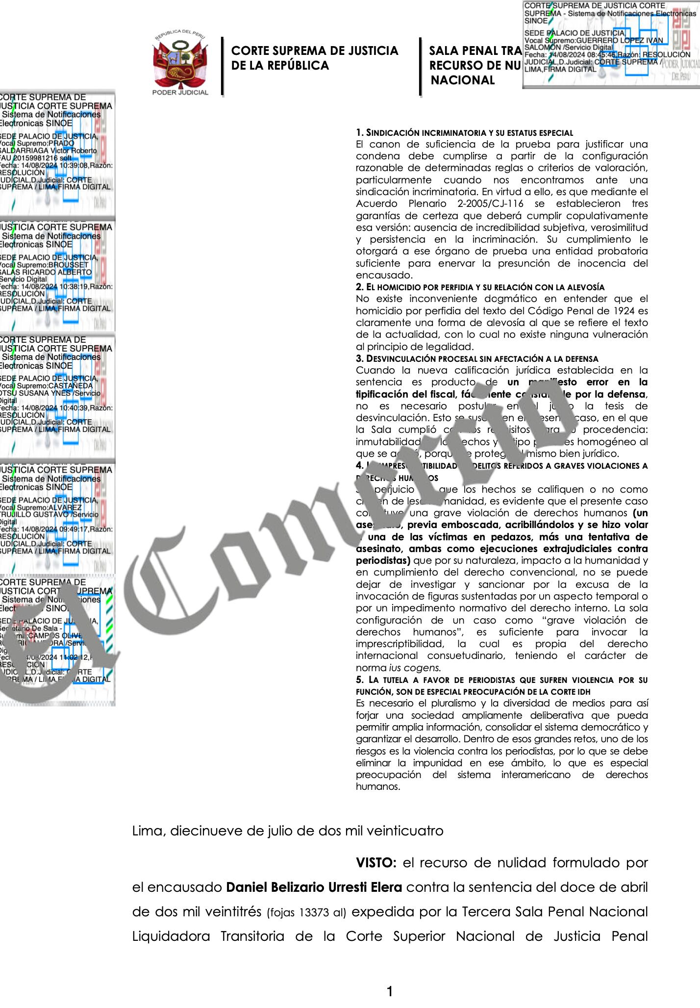 En el documento judicial, que fundamenta su decisión, la Sala Suprema Penal Transitoria sostiene que todas las pruebas actuadas han acreditado la responsabilidad de Urresti Elera . Además, se refirió a diversos aspecto vinculados al homicidio en el contexto de graves delito de lesa humanidad y a la labor de los medios de prensa.