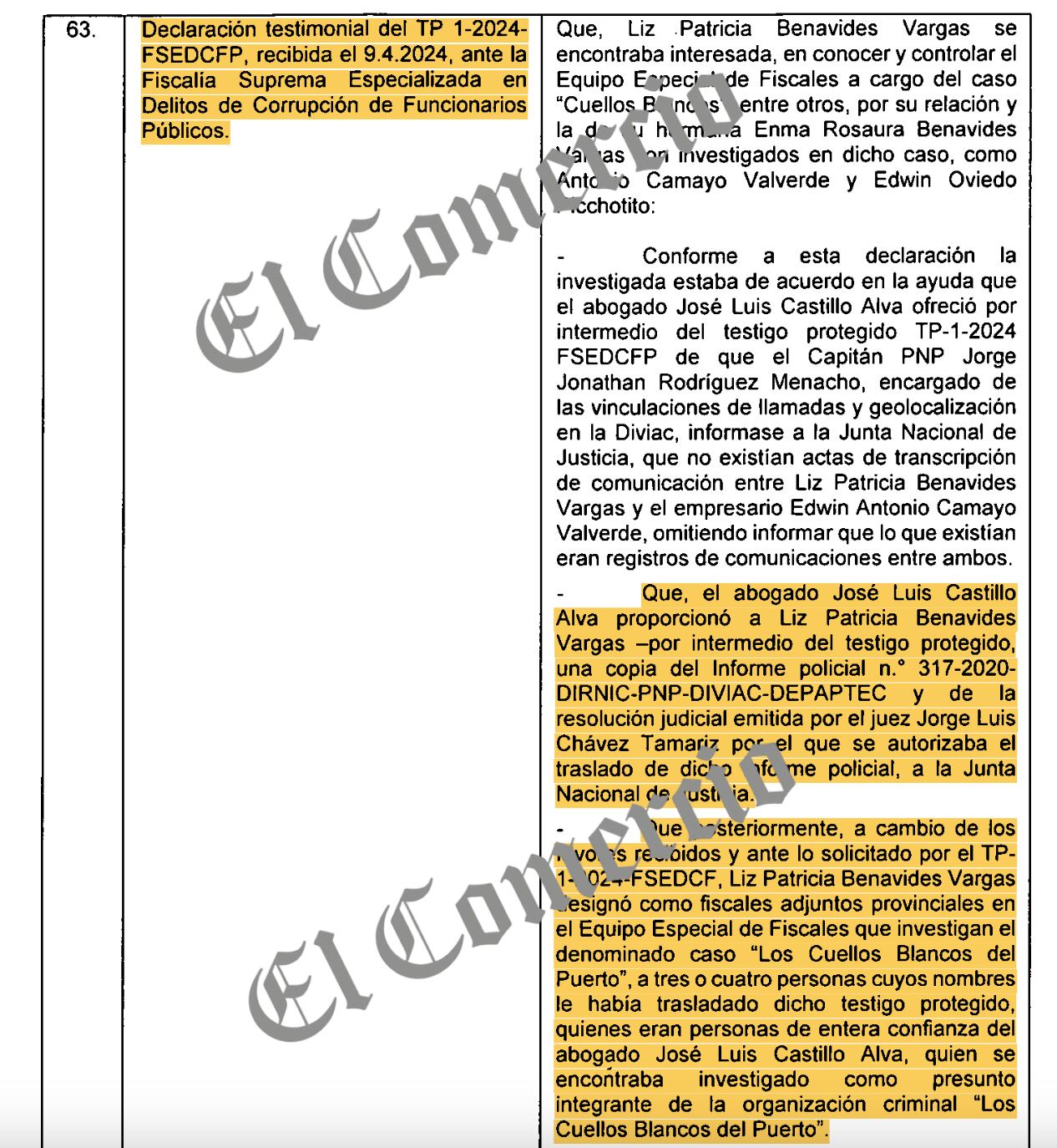 Por ello, de acuerdo con ese testimonio, Castillo Alva habría proporcionado a Benavides Vargas -por intermedio del testigo protegido- una copia del Informe Policial Nro. 317-2020- DIRNIC-PNP-DIVIAC-DEPAPTEC -vinculado al caso “Cuellos Blancos del Puerto”- y de la resolución judicial emitida por el juez Jorge Luis Chávez Tamariz por el que se autorizaba el traslado de dicho documento de la PNP, a la Junta Nacional de Justicia (JNJ).