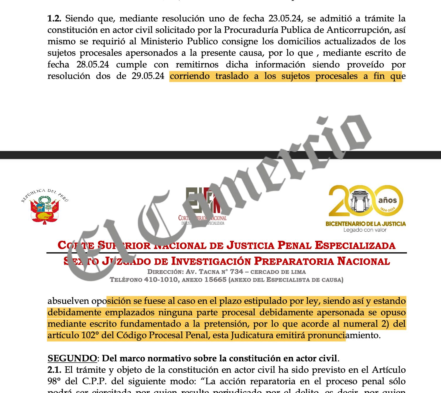El juez Cristóbal Ayala precisó en su resolución que los abogados de los procesados fueron notificados con el requerimiento de la procuraduría anticorrupción; sin embargo, ninguno de estos presentó oposición dentro del plazo de ley, por lo que procedió a declarar procedente el pedido.