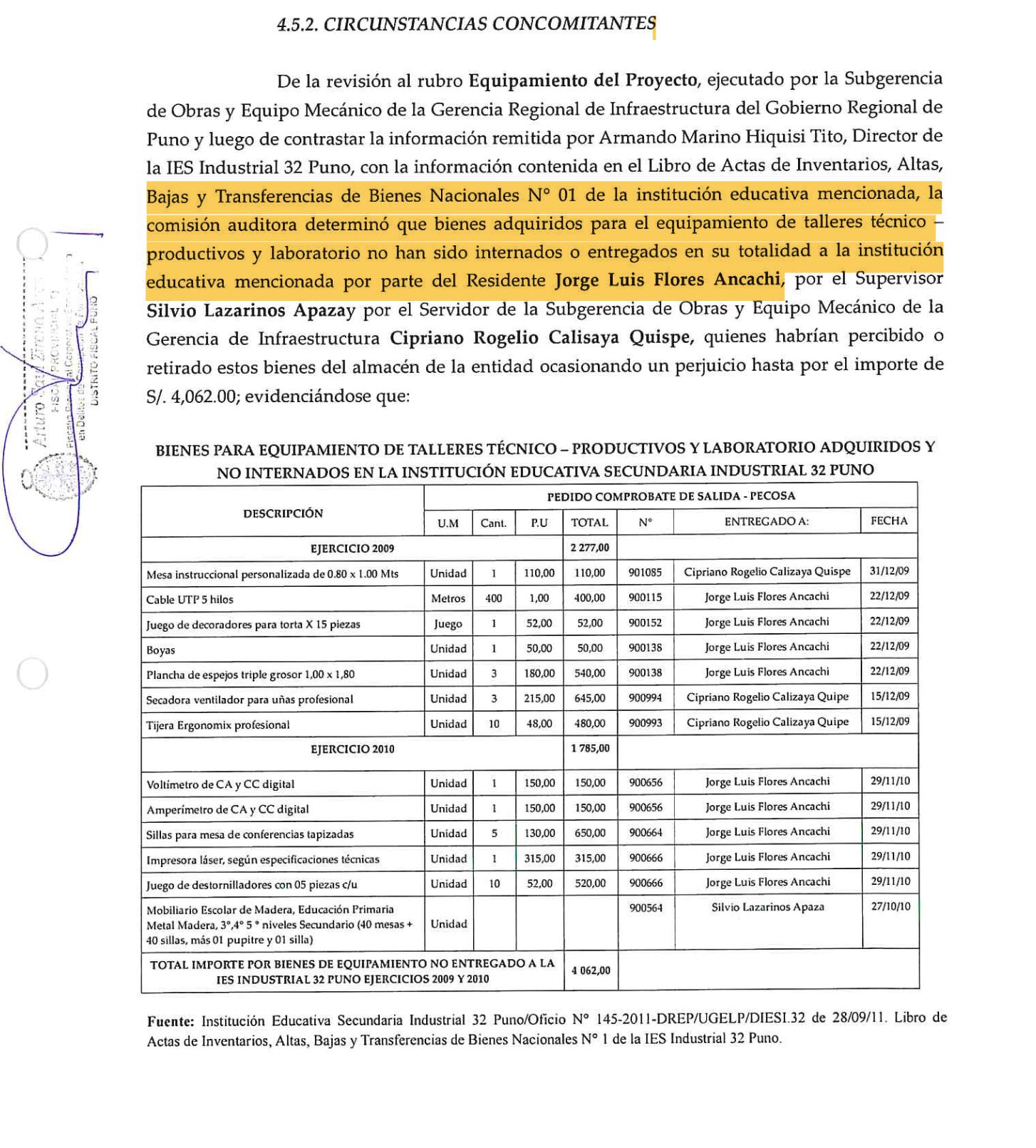 “Con la información contenida en el Libro de Actas de Inventarios, Altas, Bajas y Transferencias de Bienes Nacionales N° 01 de la institución educativa mencionada, la comisión auditora determinó que bienes adquiridos para el equipamiento de talleres técnico-productivos y laboratorio no han sido internados o entregados en su totalidad a la institución educativa mencionada por parte del Residente Jorge Luis Flores Ancachi”, se indica en el documento fiscal de formalización de investigación en su contra.