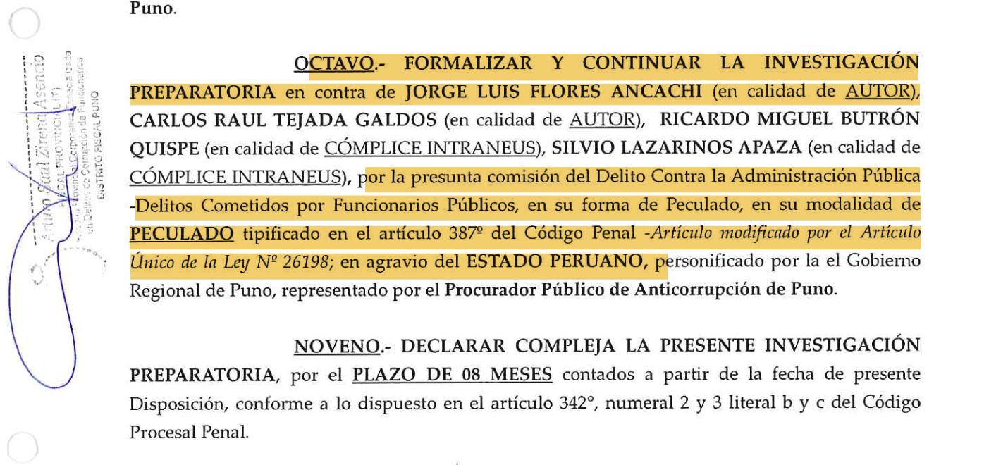 Sin embargo, el congresista Flores Ancachi también tiene en su haber otra investigación preparatoria formalizada en febrero del 2022 por el Ministerio Público ante el Poder Judicial de Puno, por el presunto delito de peculado doloso por otros dos hechos vinculados al proyecto “Fortalecimiento de desarrollo educativo de Institución Educativa Secundaria Industrial 32 - Puno”, ejecutada por el Gobierno Regional de Puno.