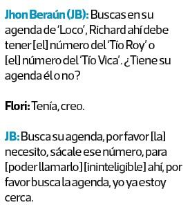 En otro diálogo, Jhon Beraún pidió a su cuñada buscar en la agenda de su hermano Richard los teléfonos de policías: “¿Cómo se llaman esos amigos policías? [...] ¿'Riky’ y ‘Roy’? A ver, le van a ayudar a salir a Richard, no, ¿ya?”.