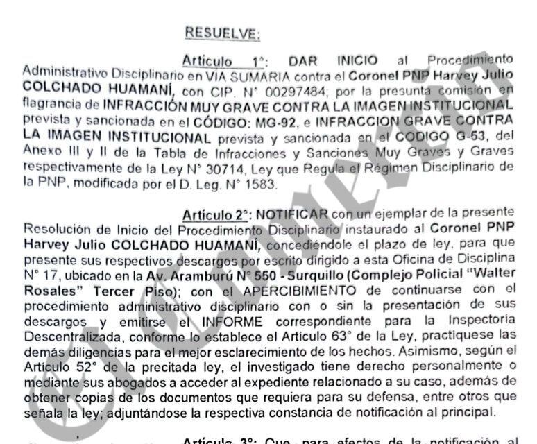 Por todo esto, se decidió abrir al coronel Harvey Colchado un proceso disciplinario por falta muy grave y falta grave. Lo primera se sanciona hasta con 1 o 2 años fuera de servicio; lo segundo, con una sanción escrita.