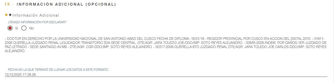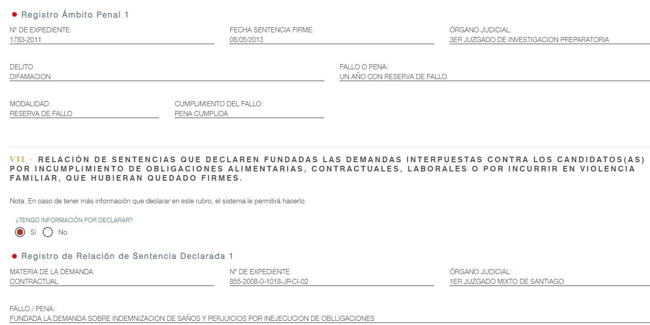 También reportó otro fallo del 2014 en su contra, por haber cobrado dietas por sesiones de concejo no realizadas cuando fue regidor de la Municipalidad Distrital de Santiago, en Cusco.