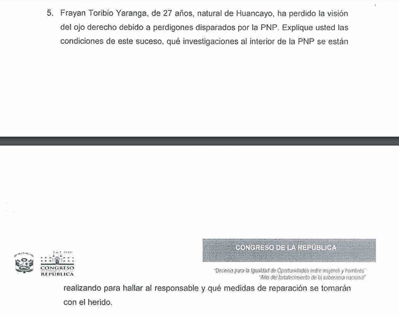 “Si bien presenta una lesión en la vista, se tiene conocimiento que ese día y antes del evento personal policial no portaba perdigones de goma. Estos recién fueron entregados a partir de las 15:50”, detalla Chávarry.