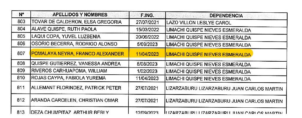 Sin embargo, tras el cambio de gobierno, Pomalaya también dejó el Ejecutivo y pasó a laborar en el Congreso. Según registros del Parlamento obtenidos por este Diario, en febrero de este año ingresó como auxiliar de la bancada Perú Democrático y, desde abril, se desempeña como auxiliar en el despacho de la congresista Nieves Limachi (Cambio Democrático – Juntos por el Perú).