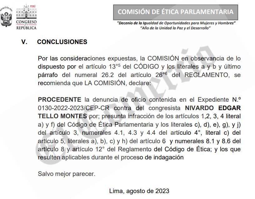Con ello, la comisión respaldó el informe que recomendó declarar procedente la denuncia contra Tello por presunta infracción al Código de Ética Parlamentaria y al Reglamento del Código de Ética.