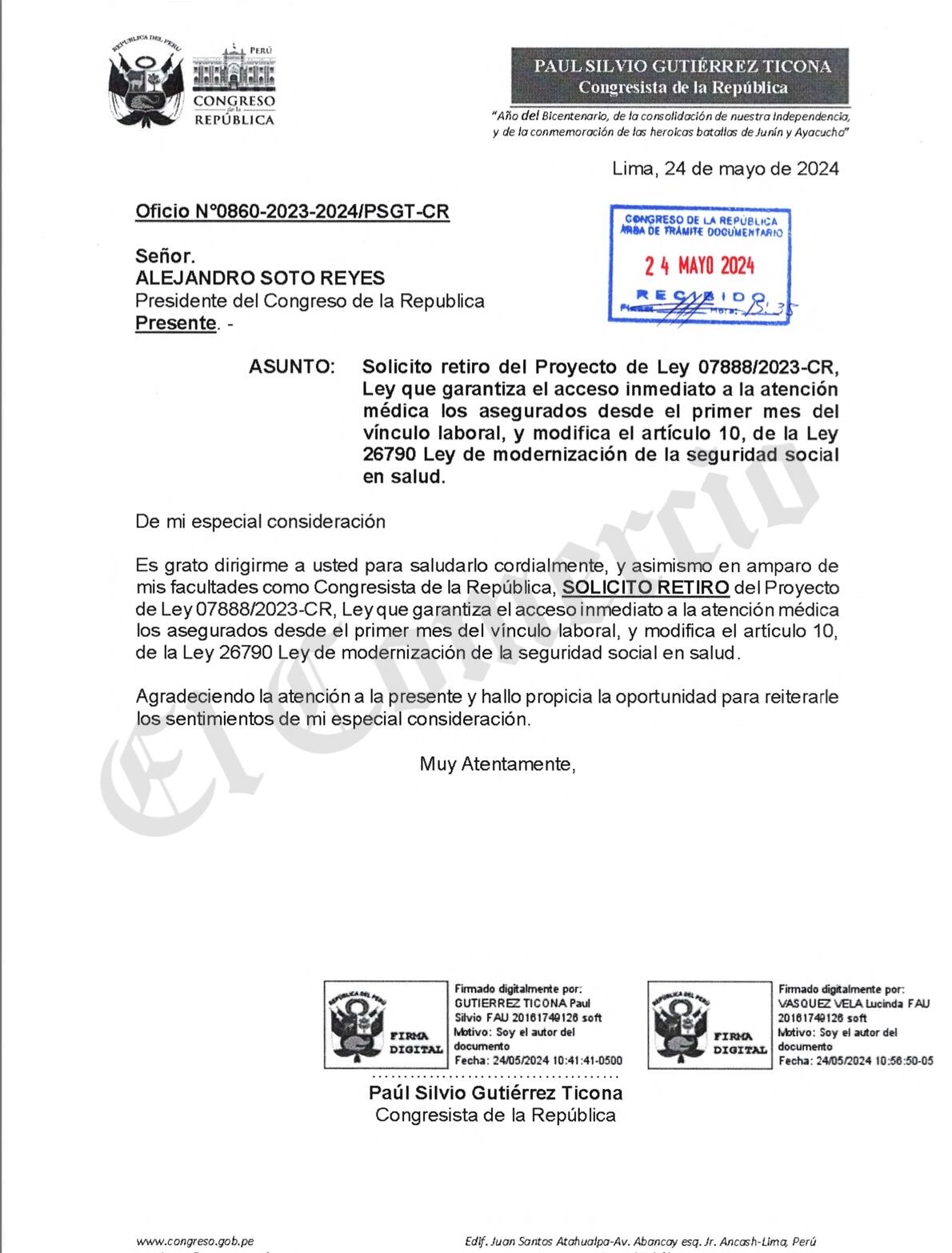 En ambos oficios, enviados el 23 y 24 de mayo, respectivamente, Gutiérrez solicita el retiro de los proyectos al presidente del Congreso, Alejandro Soto, pero no explica el motivo.