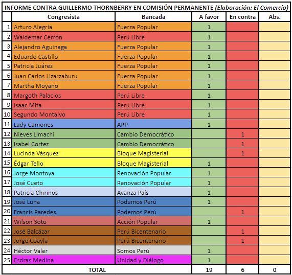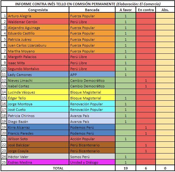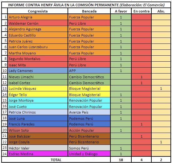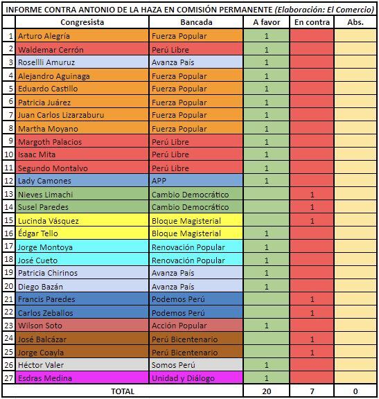 Las únicas bancadas que votaron constantemente en contra o en abstención del informe fueron las de Cambio Democrático-Juntos por el Perú y Perú Bicentenario.