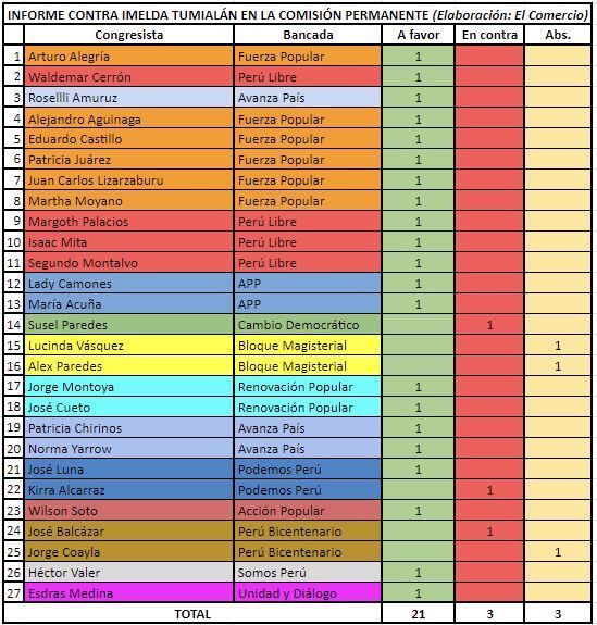 En cada caso, los votos vinieron principalmente de Fuerza Popular, con sus integrantes en la Comisión Permanente más el primer vicepresidente de la Mesa Directiva, Arturo Alegría, y de Perú Libre, con sus legisladores y con el tercer vicepresidente, Walder Cerrón. Los apoyos también vinieron desde Avanza País, Renovación Popular, Acción, Popu,ar Somos Perú, y Unidad y Diálogo.