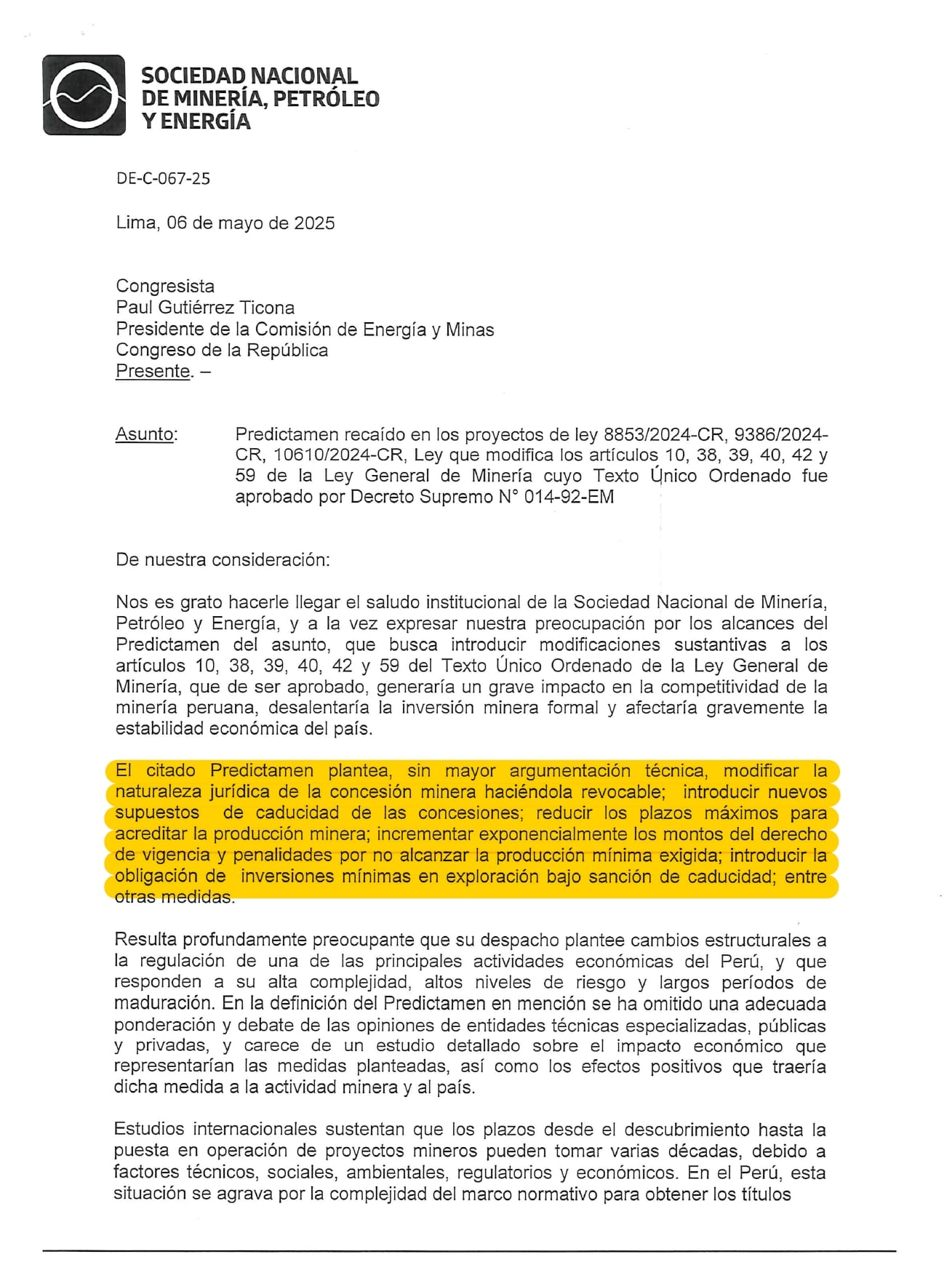Desde la Sociedad Nacional de Minería, Petróleo y Energía (SNMPE) se advirtió que esta propuesta carece de argumentación técnica, “generaría un grave impacto en la competitividad de la minería peruana, desalentaría la inversión minera formal y afectaría gravemente la estabilidad económica del país”. Así se le hizo saber a través de un escrito a Gutiérrez.