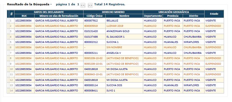 Pero, además de Franco Béquer, también hay otros mineros informales que acudieron a la mesa de trabajo y que han tenido o mantienen aspiraciones políticas. Entre otros personajes está Raúl García Melgarejo, quien ostenta a su nombre hasta 14 registros en el Reinfo. Todos ellos, en la región Huánuco, entre las provincias de Puerto Inca y Huamalíes, de los cuales cinco están suspendidos. En 2002, García intentó ingresar a la política y postuló a regidor provincial de Huamalíes, pero no tuvo éxito.