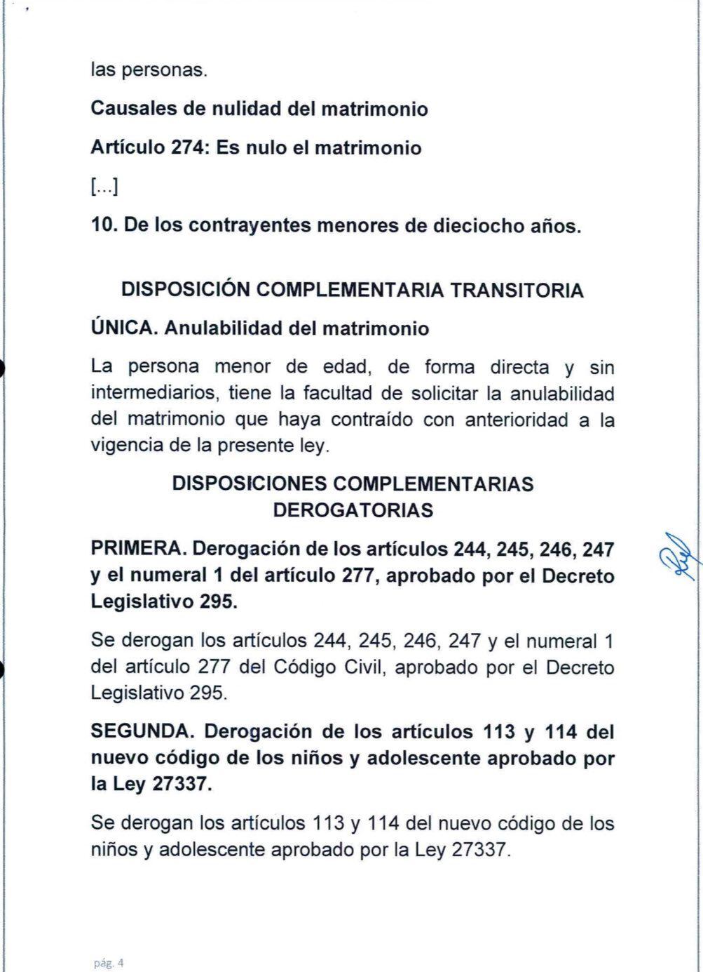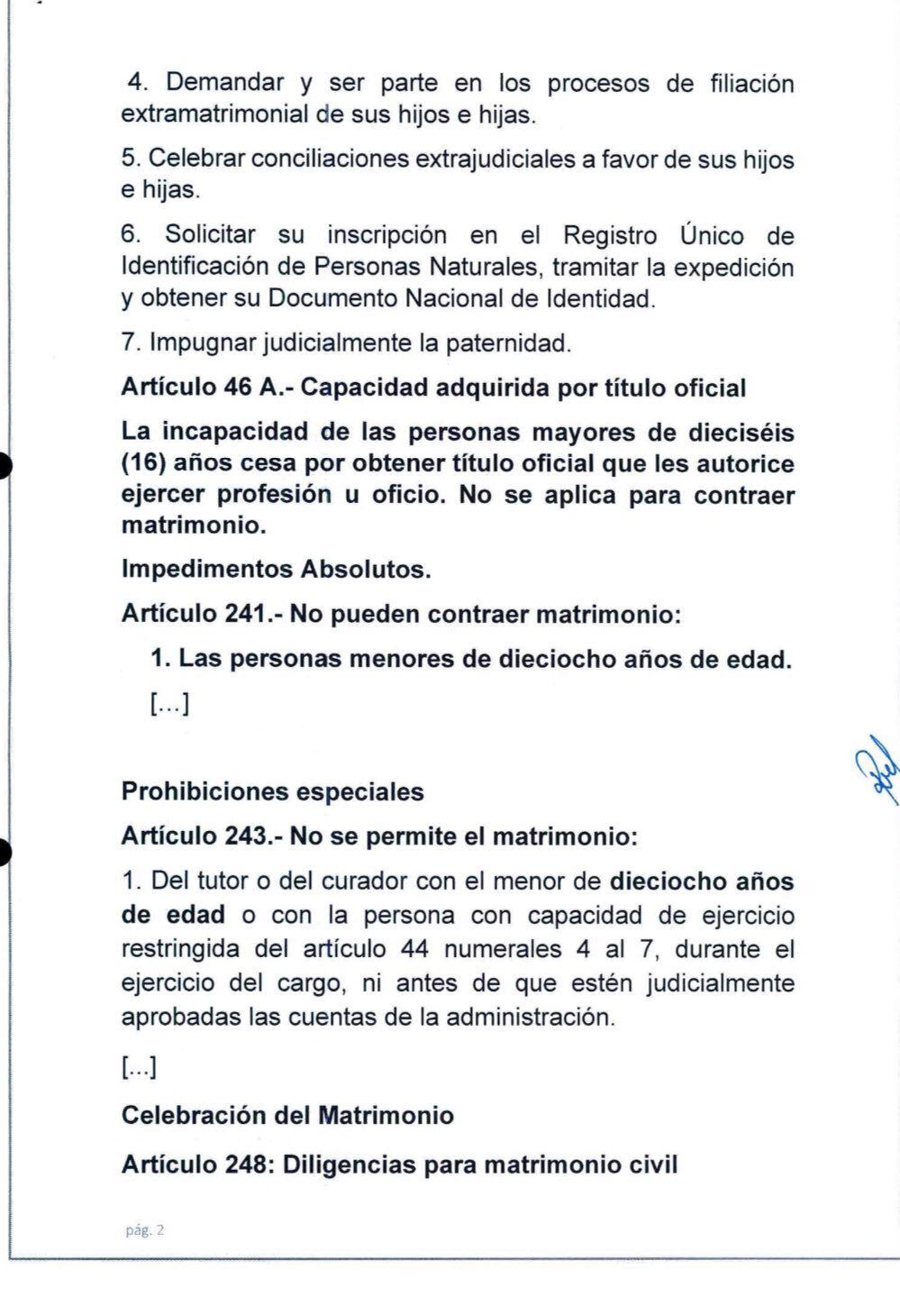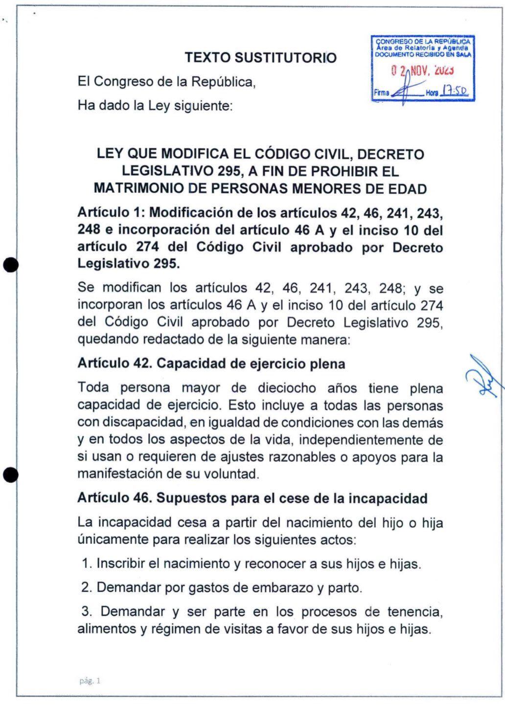 El texto sustitutorio —presentado a las 5:50 p.m. y con el que finalmente se llegó a un consenso entre las bancadas — modifica los artículos 42, 46, 241,243, 248 del Código Civil e incorpora el artículo 46-A y el inciso 10 al artículo 274; “a fin de prohibir el matrimonio entre personas menores de edad”.