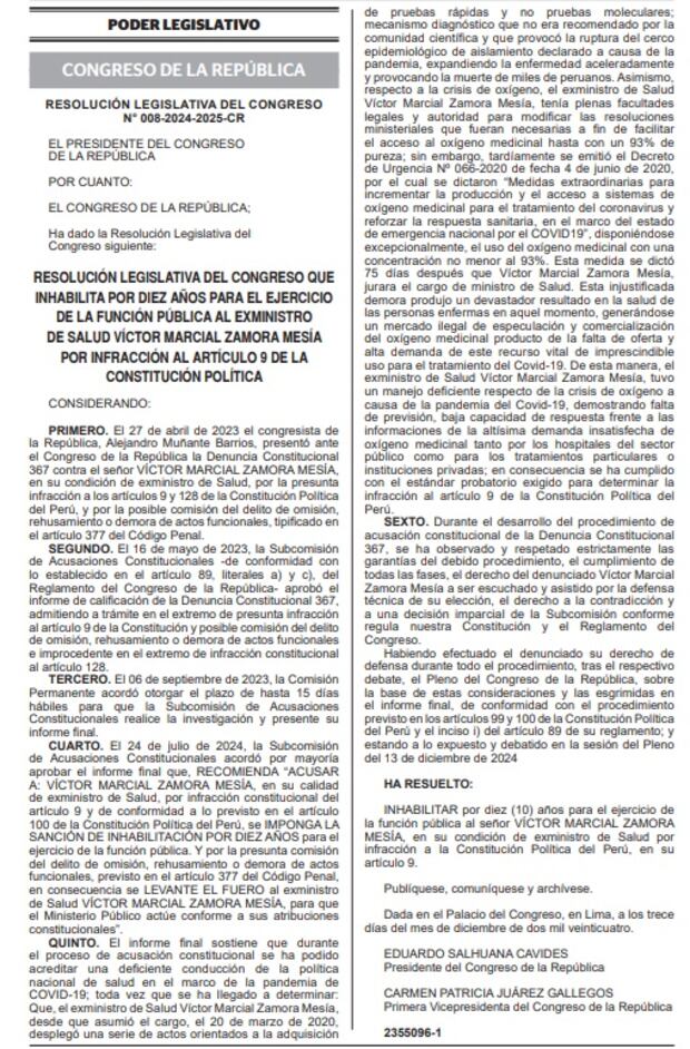 La Resolución Legislativa del Congreso N° 008-2024-2025-CR fue publicada en una edición extraordinaria del boletín de Normas Legales del Diario Oficial El Peruano.