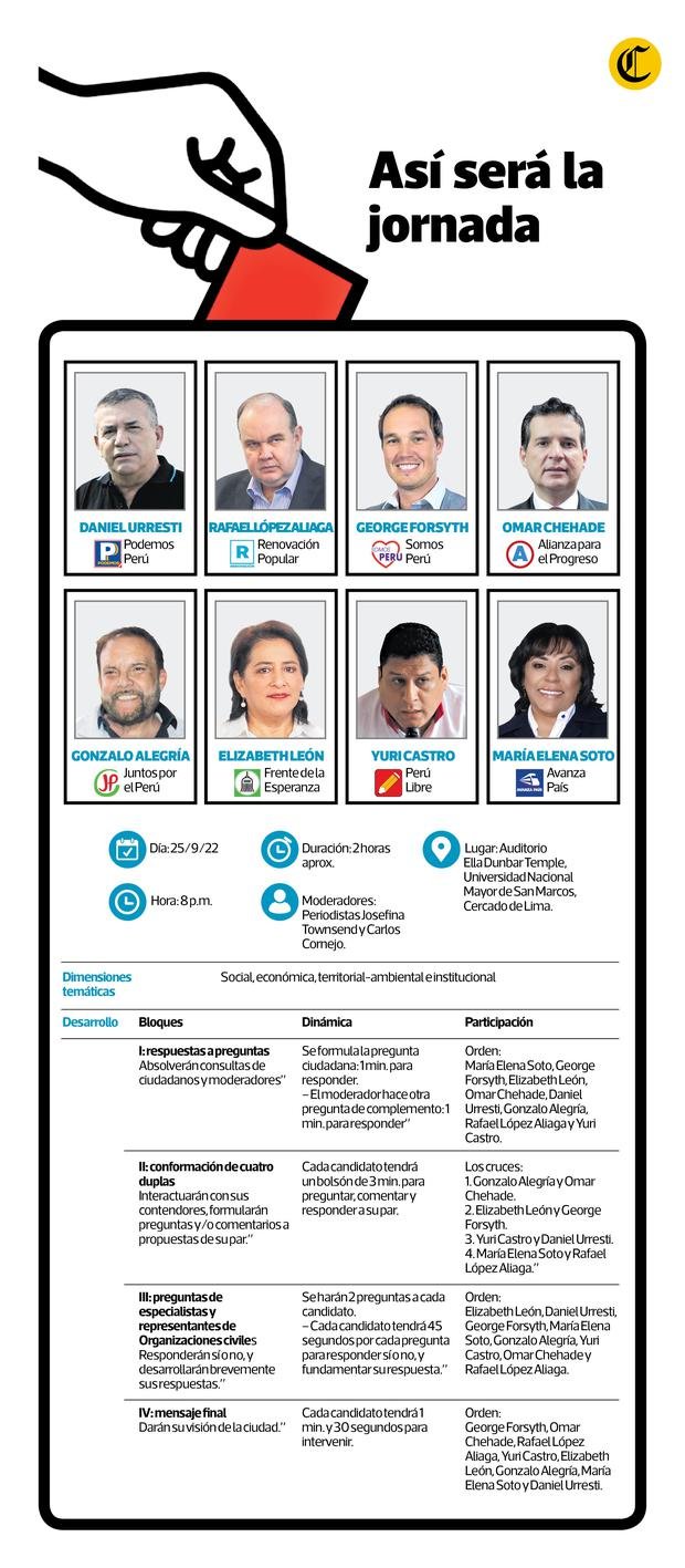 Intervendrán en el debate Daniel Urresti (Podemos Perú), Rafael López Aliaga (Renovación Popular), George Forsyth (Somos Perú), Omar Chehade (Alianza para el Progreso), Gonzalo Alegría (Juntos por el Perú), Elizabeth León (Frente de la Esperanza), Yuri Castro (Perú Libre) y María Elena Soto (Avanza País).