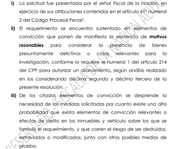 “De los citados elementos de convicción se desprende la necesidad de las medidas solicitadas por cuanto existe una alta probabilidad que exista elementos de convicción relevantes o efectos de delito en los inmuebles y vehículo sobre los que se formuló el requerimiento, y que corren el riesgo de ser destruidos, extraviados o modificados, junto con otros posibles medios de prueba”, dice el documento del Poder Judicial.