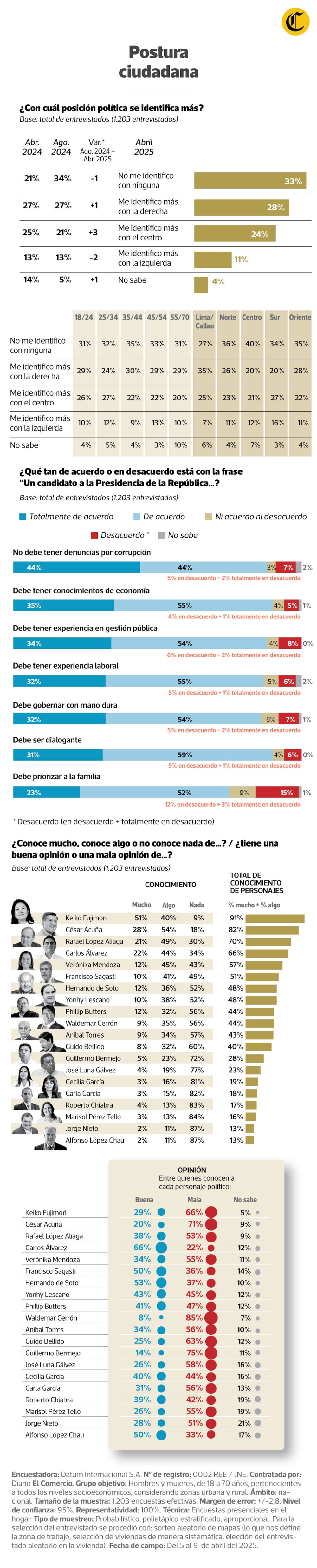 A menos de un año para la contienda electoral, un 52% de peruanos asegura sentirse identificado con una postura más de derecha o de centro –28% y 24%, individualmente–; mientras apenas un 11% dice simpatizar con la izquierda. Y un 33% indica no identificarse con ninguna de ellas, según una encuesta a escala nacional de Datum Internacional para El Comercio.