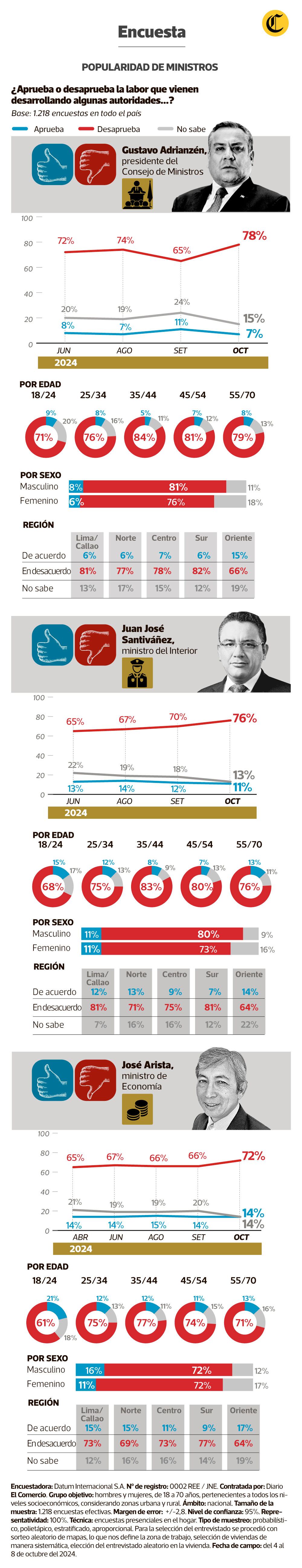 También llega a los titulares de las carteras de Economía y Finanzas (José Arista) e Interior (Juan José Santiváñez), cuya desaprobación subió hasta seis puntos porcentuales en ambos casos. Arista pasó de 66% en desaprobación que registró en setiembre a 72% ahora en octubre; mientras que Santiváñez pasó de 70% al 76% de rechazo en el mismo período.
