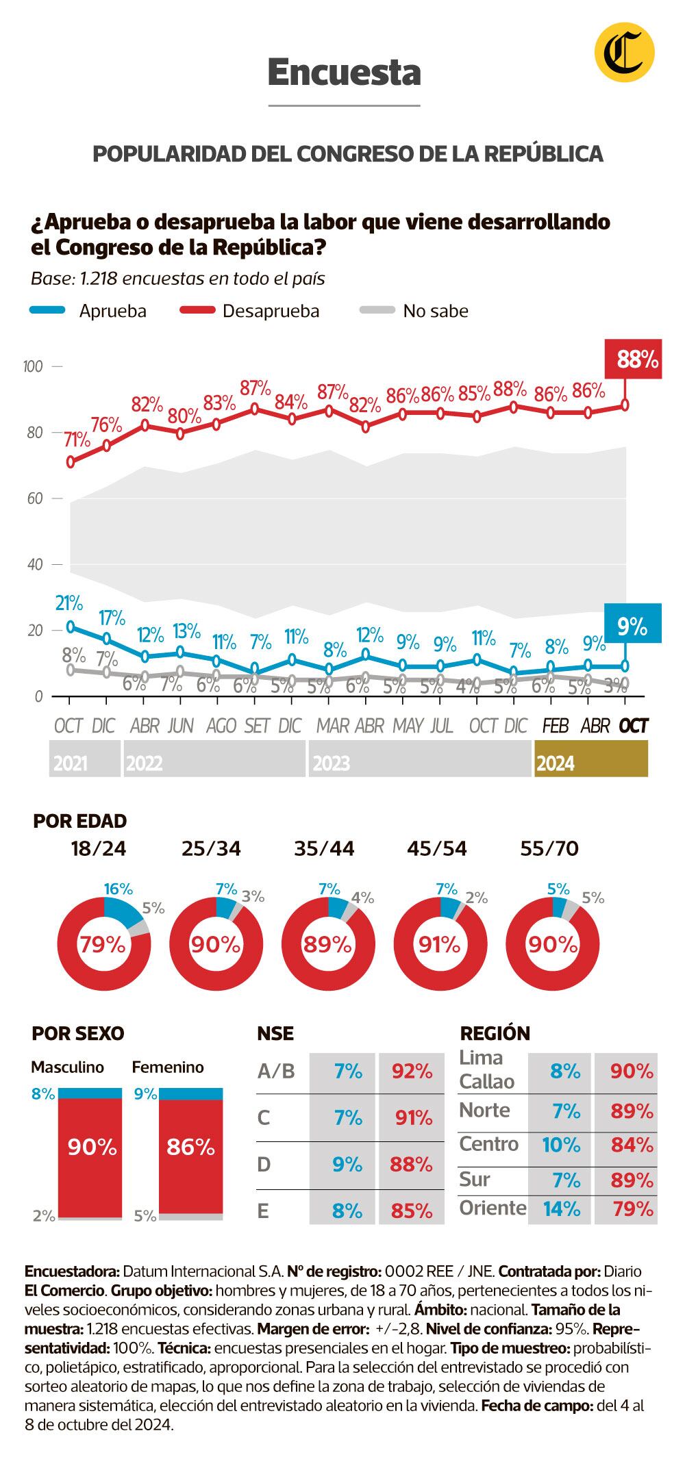 El estudio de opinión —realizado del 4 al 8 de octubre, a escala nacional— da cuenta de que el descontento de la ciudadanía se presenta de manera transversal, por regiones y niveles socioeconómicos. Aunque en este último caso, esto es aún más significativo en los sectores A/B y E.