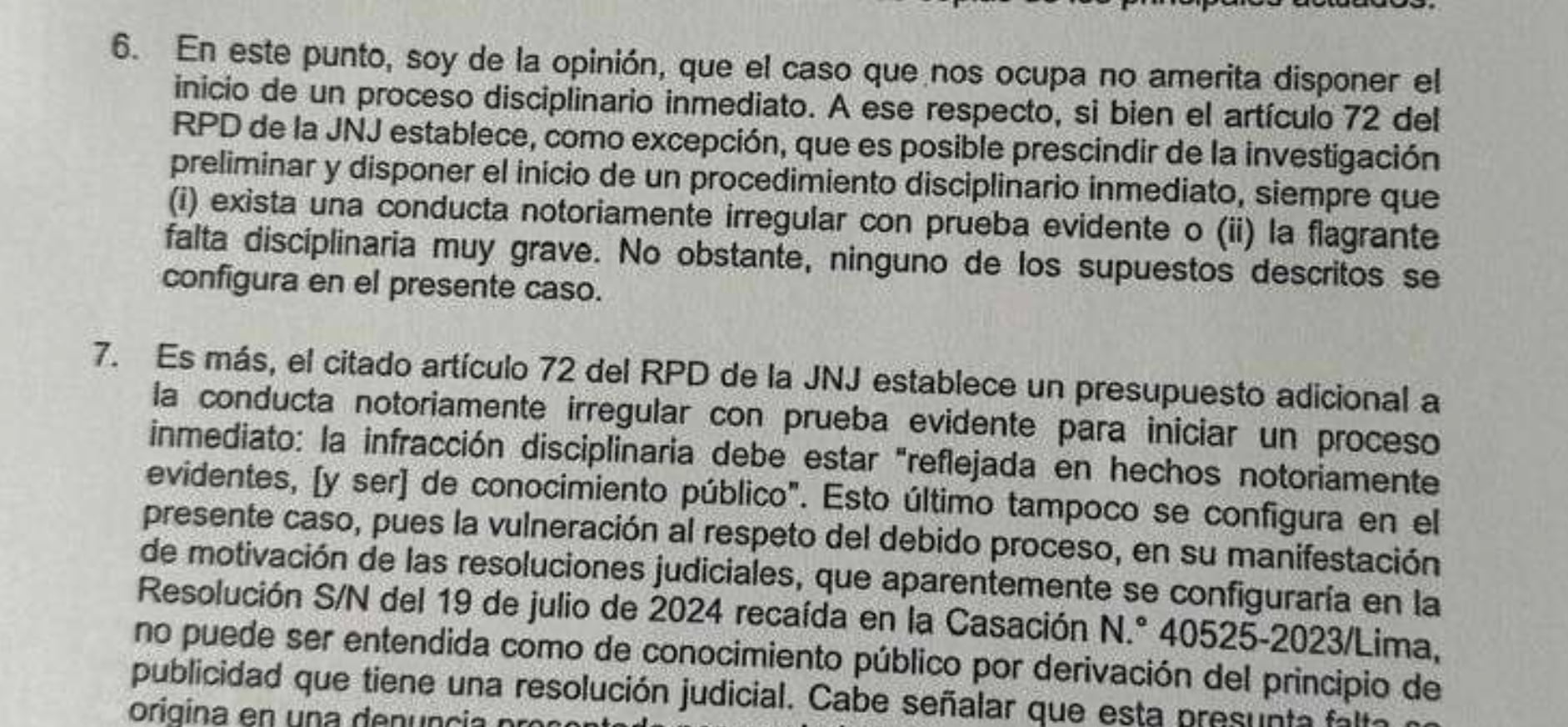 Esto, también fue parte de los argumentos usados por el presidente de la JNJ Gino Ríos, la vicepresidenta, María Teresa Cabrera, y los consejeros Víctor Chanduví y Rafael Ruiz; para concluir que el caso ameritaba, dejar de lado la investigación preliminar y pasar directamente a un “proceso disciplinario inmediato”.