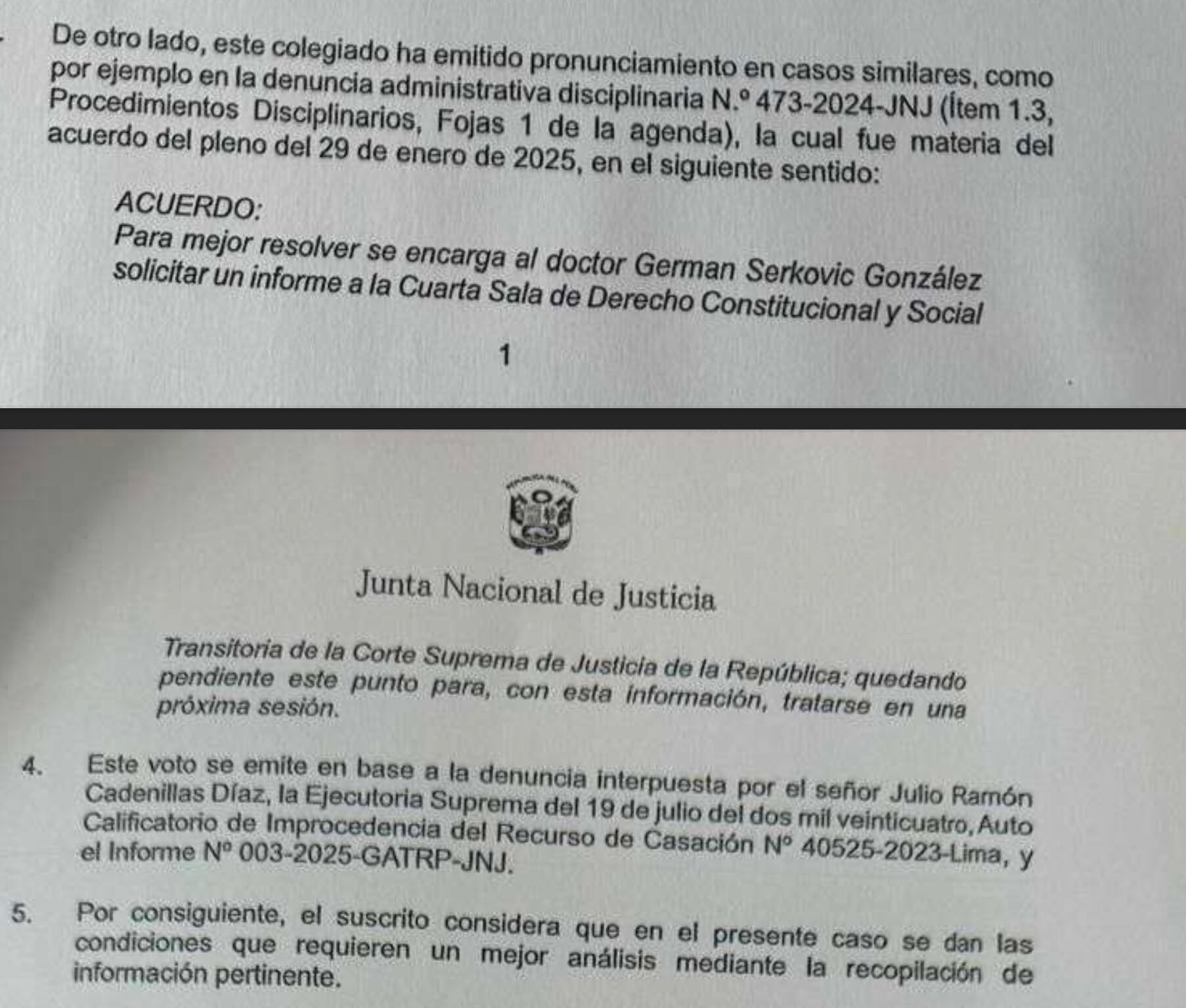 Finalmente, tras analizar la denuncia, el consejero Serkovic concluyó que la resolución del recurso de Casación N.°40525-2023/Lima -cuestionada por el denunciante Julio Cadenillas- no se hace referencia alguna al artículo 388 del Código Procesal Civil, como alega el denunciante.