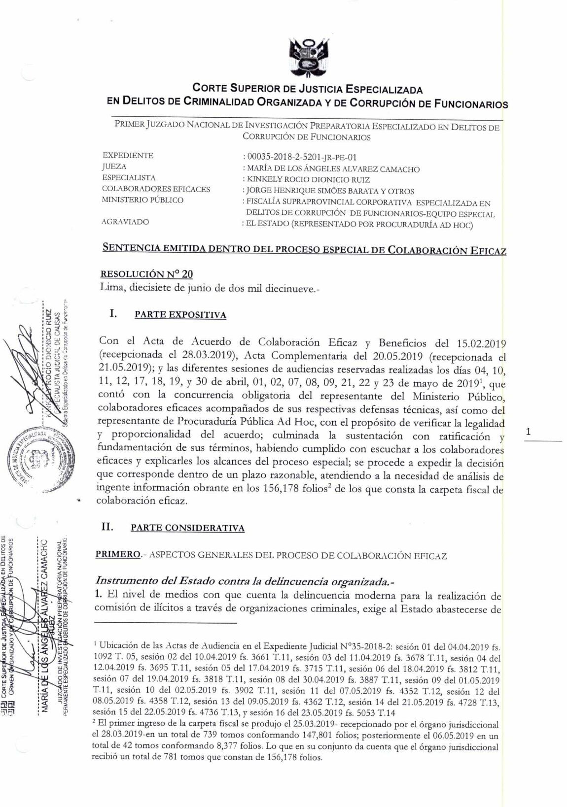 “Convocar a audiencia privada virtual de revocatoria de Acuerdo de Colaborador Eficaz del ciudadano Jorge Henrique Simões Barata, solicitada por el representante del Ministerio Público, para el día jueves 05 de diciembre de 2024 a las 09:00 A. M., la misma que se realizará a través del uso tecnológico de videoconferencia”, indica la resolución.