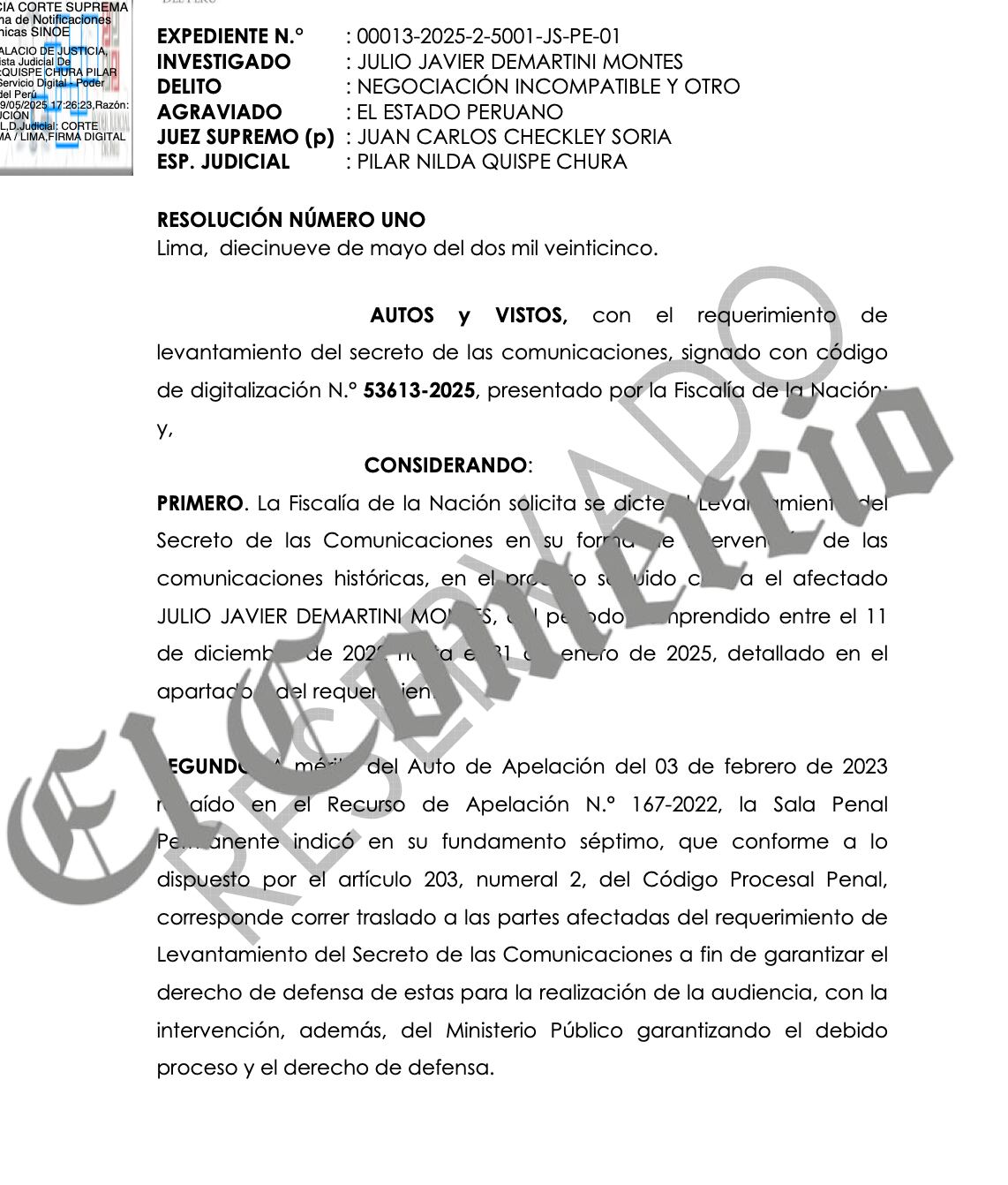 “La Fiscalía de la Nación solicita se dicte el Levantamiento del Secreto de las Comunicaciones en su forma de intervención de las comunicaciones históricas, en el proceso seguido contra el afectado Julio Javier Demartini Montes, del periodo comprendido entre el 11 de diciembre de 2022 hasta el 31 de enero de 2025.”