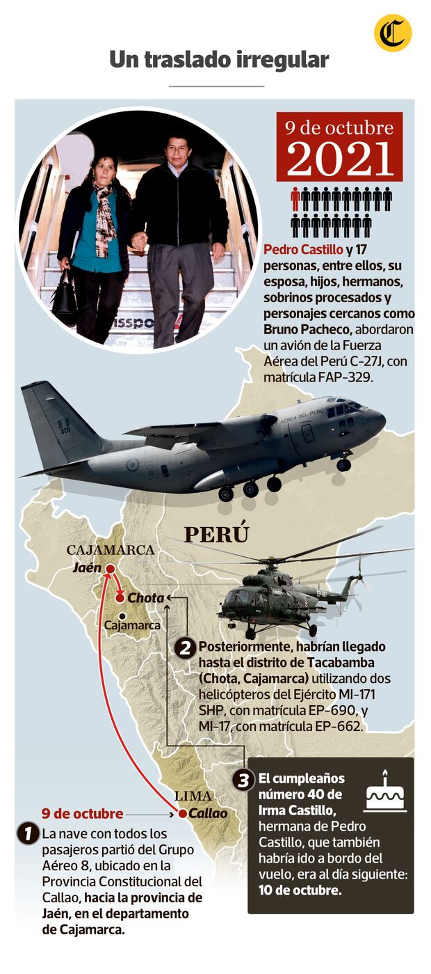 De acuerdo con la información fiscal, Castillo en su condición de jefe del Estado “habría dispuesto la realización del referido viaje aéreo” para que, junto a sus familiares y sus allegados, sean trasladados desde la base aérea ubicada en la provincia constitucional del Callao a Jaén (Cajamarca). Sin embargo, el fin era otro.