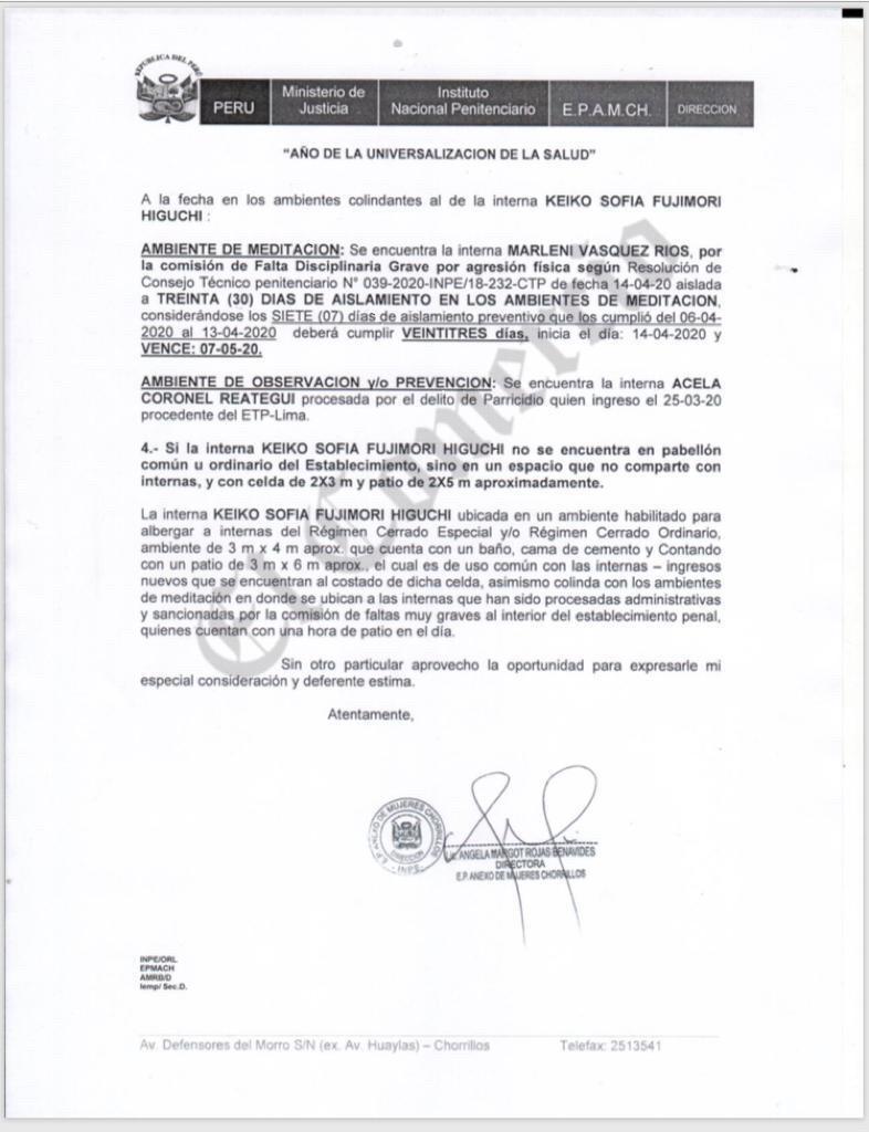 Rojas Benavides, directora del establecimiento penitenciario Anexo de Mujeres de Chorrillos, respondió al fiscal Pérez que Keiko Fujimori se encuentra en calidad de procesada por el presunto delito de lavado de activos bajo el régimen cerrado ordinario o régimen cerrado especial. En virtud a ello, ella se encuentra en un ambiente habilitado para ese fin. El área de ese espacio que solo ocupa ella es de 3 metros por 4 metros y cuenta con con un baño y cama de cemento. También tiene acceso a un patio de 3 metros por 6 metros , el cual es de uso común por las internas nuevas.