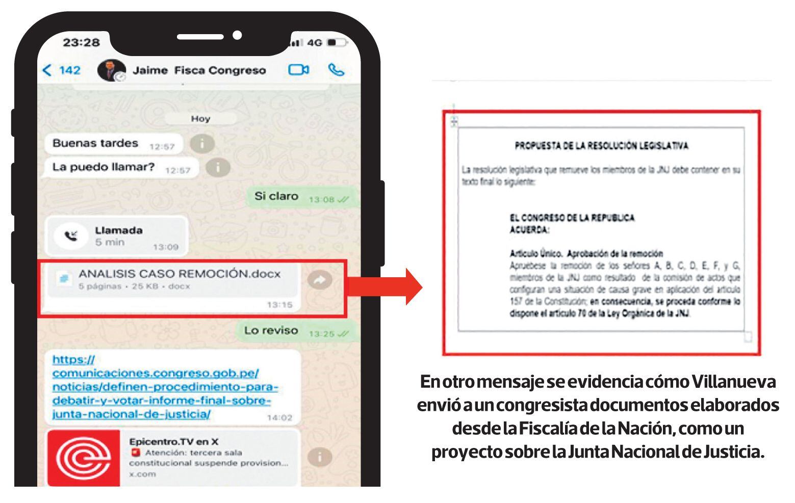 Villanueva también intervino en la remoción de la JNJ. En un diálogo se registra el envío de un documento vinculado al caso.