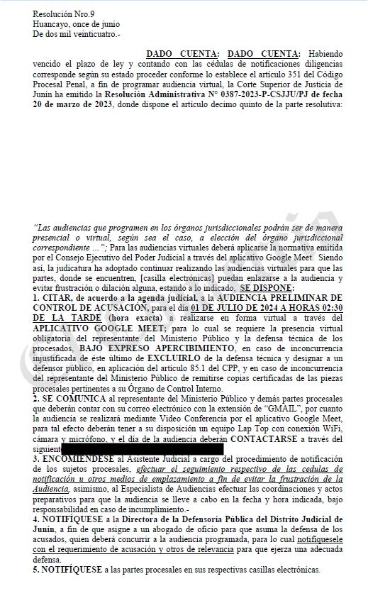 “Para lo cual se requiere la presencia virtual obligatoria del representante del Ministerio Público y la defensa técnica de los procesados, bajo expreso apercibimiento, en caso de inconcurrencia injustificada de este último, de excluirlo de la defensa técnica y designar a un defensor público”, se indicó en la resolución.