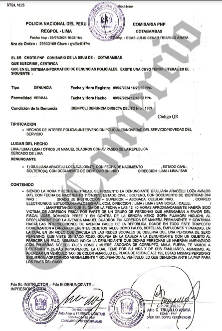 "Denuncio la cobarde agresión que ha sufrido hoy Giulliana Loza a la salida de la sala de audiencias. Un grupo de manifestantes que apoyaba al fiscal José Domingo Pérez la siguió y atacó por la espalda con palos en la cabeza sin que haya ningún tipo de seguridad ni protección mínima, demostrando que no existe ninguna garantía", aseguró la lideresa de Fuerza Popular en sus redes sociales.