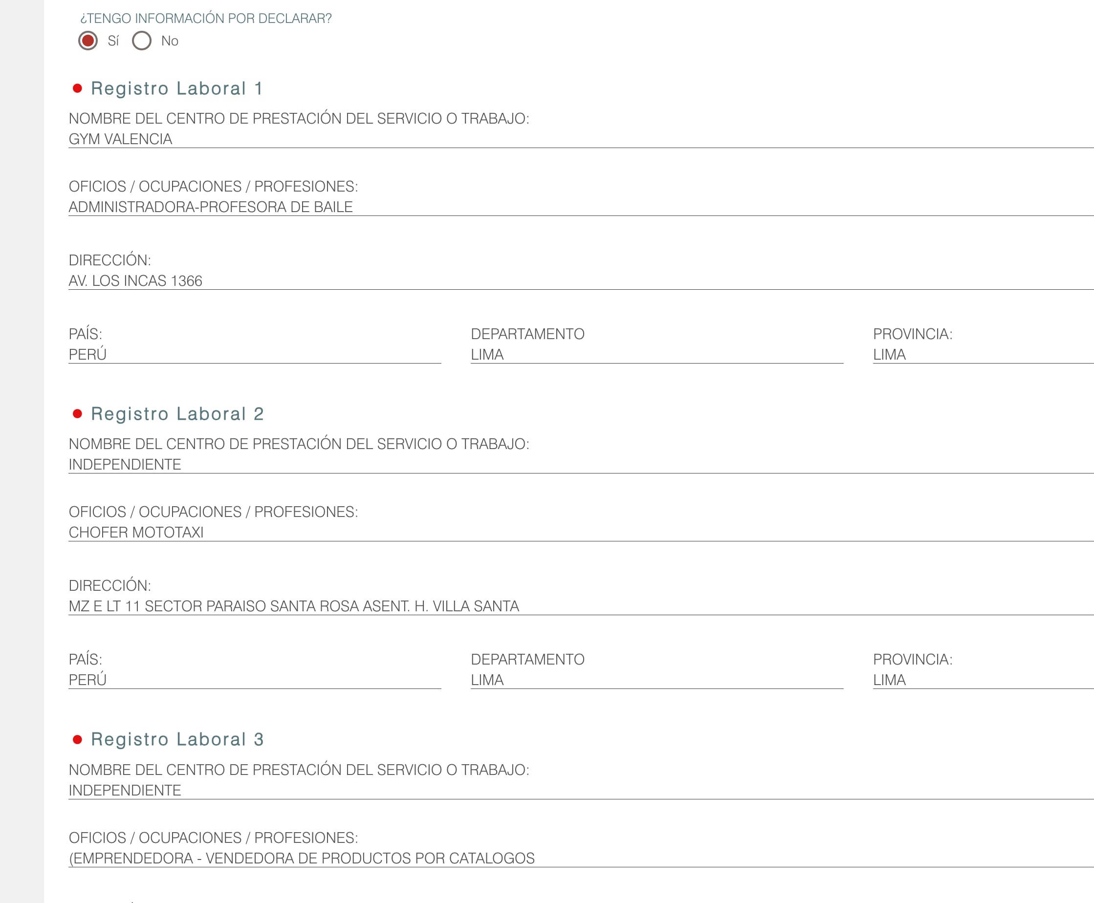 Según su hoja de vida, presentada al momento de postular, registra tres trabajos independientes: Administradora e instructora de baile en el Gimnasio Valencia (Lurín), chofer de mototaxi (Villa María del Triunfo) y vendedora de productos por catálogo.
