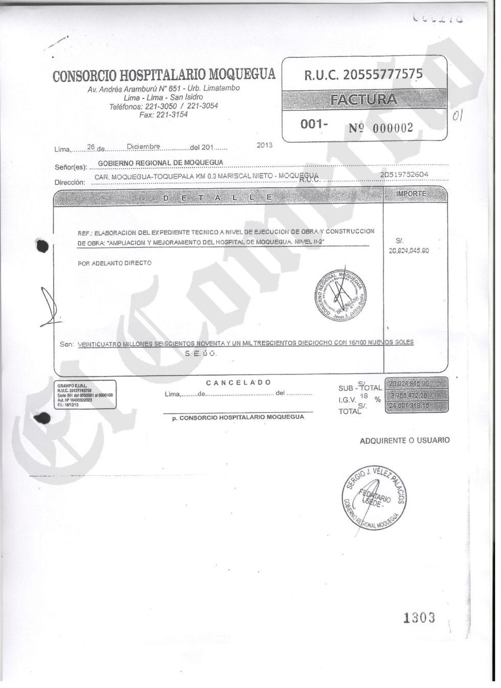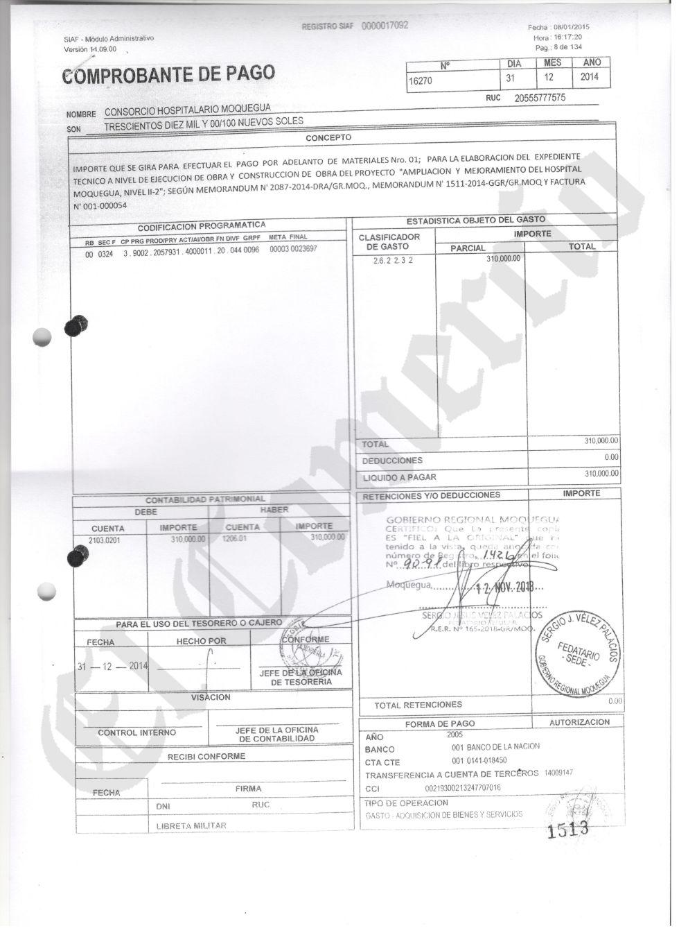 Este Diario comprobó que el 31 de diciembre, en la víspera del Año Nuevo, el Gobierno Regional de Moquegua autorizó el desembolso al consorcio por S/41’869.086. Pero no se hizo en un solo abono, sino a través de 133 comprobantes de pago girados el mismo día: 131 por montos de S/310.000 cada uno, uno por S/256.217 y otro por S/31.000. Adicionalmente, se emitieron otros comprobantes de pago por un total de S/971.868.
