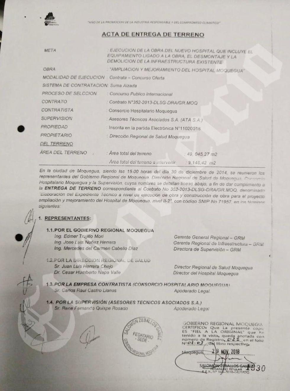 Según el acta de entrega del terreno, el GRM cedió el área donde se construiría el hospital el 30 de diciembre entre las 3 y 4 p.m. En esa ceremonia, estuvieron representantes del consorcio, de ATA y del gobierno regional. Entre estos últimos, estuvo Trujillo.