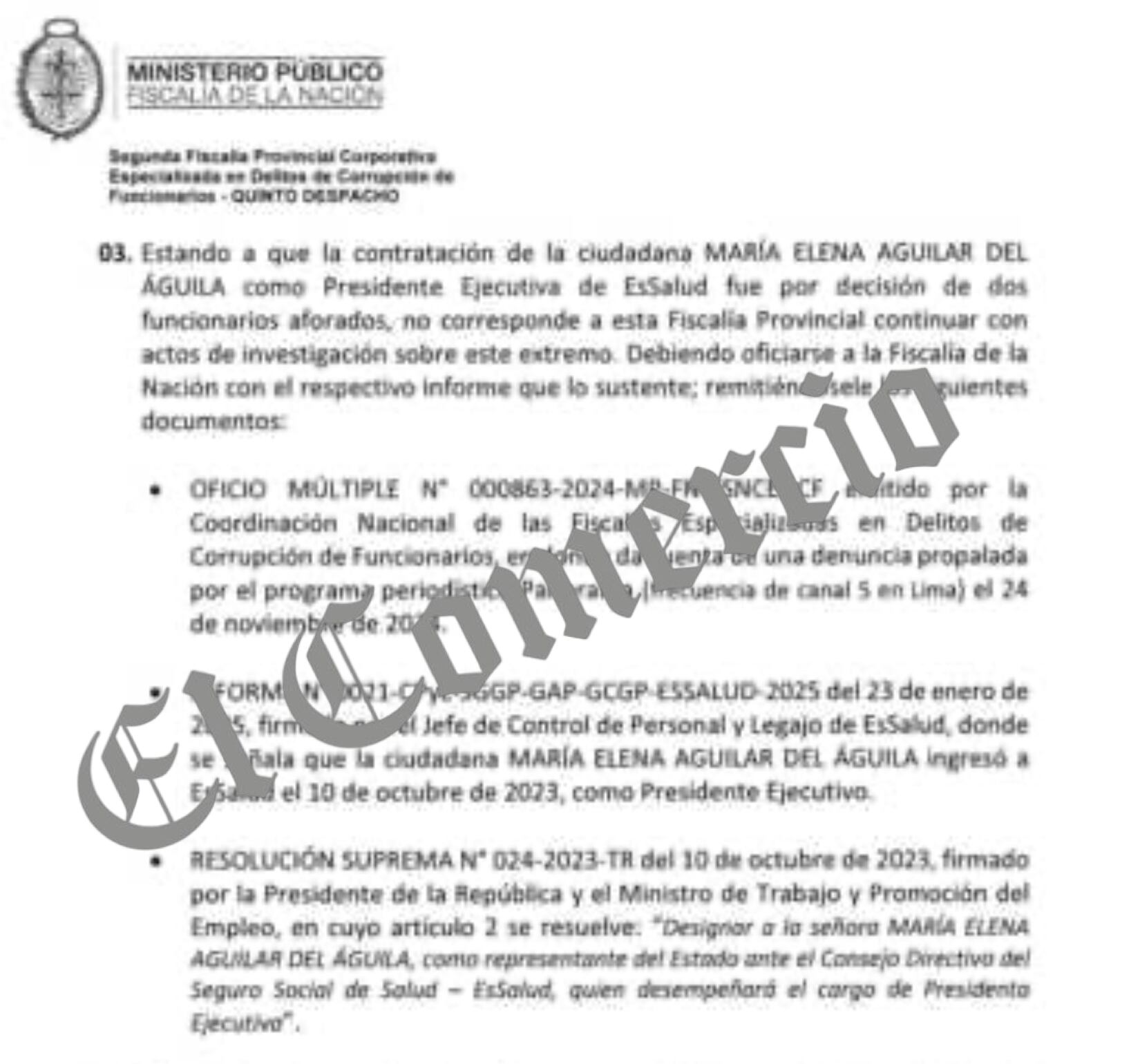 “Estando a que la contratación de la ciudadana María Elena Aguilar Del Águila como Presidente Ejecutiva de EsSalud fue por decisión de dos funcionarios aforados, no corresponde a esta Fiscalia Provincial continuar con actas de investigación sobre este extremo. Debiendo oficiarse a la Fiscalía de la Nación con el respectivo informe.”
