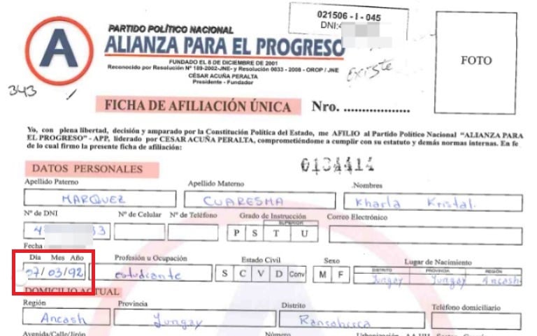 El Jurado Nacional de Elecciones (JNE) solicitó a la ciudadana Kharla Márquez Cuaresma que demuestre, mediante una prueba grafotécnica, que el partido Alianza para el Progreso (APP) la afilió sin su consentimiento.