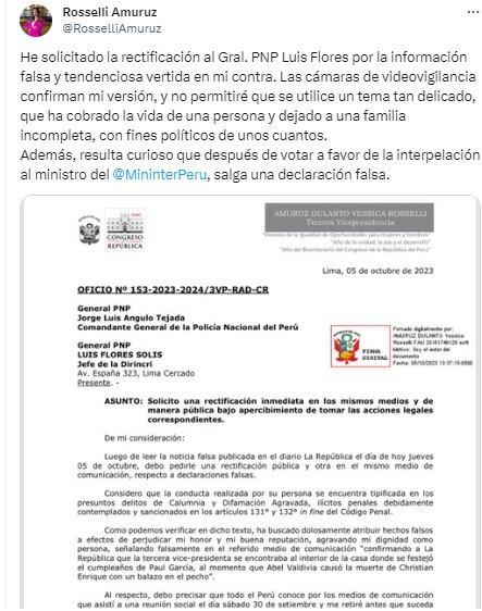 Posteriormente, Amuruz volvió a pronunciarse en X, pero esta vez aseveró que se retiró del lugar “antes de que sucediera este hecho lamentable”. Además, pidió que el general de PNP Luis Flores se rectifique por haber asegurado que ella se encontraba en el inmueble de Lince cuando ocurrió el crimen de Enrique.